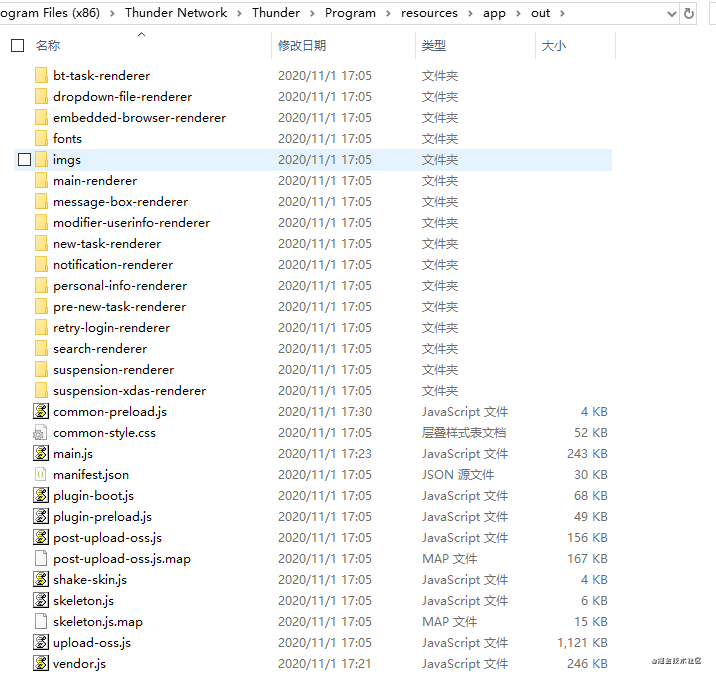 - Electron 的主入口是处理过了的,通过 Thunder.exe 程序干了很多除了启动前端以外的事情,这个定制还是挺棒的,因为这样就可以把各种进程模块管理起来,不会出现多个独立进程。就我所看到的不少 Electron 应用其实都没有定制过。