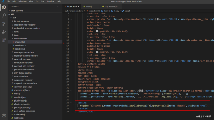 既然 js 都暴露了,也没什么好绕的,直接植入代码吧。我们都知道 Electron 是有 render 进程和 Node 进程的,接下来这一步需要猜猜看哪个文件是负责 render 主进程的?好吧不用猜,名字都非常人类可读,就 main-renderer(主窗口渲染进程)。打开找到 html 文件(js也可以)插入如下这串。