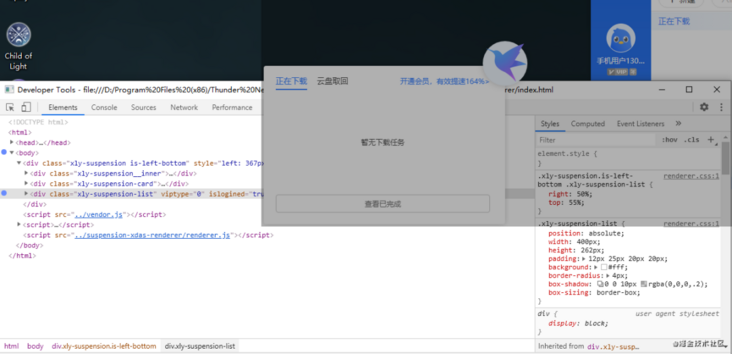 然后看了一下,迅雷的悬浮小圆圈和主窗口,分别用一个 BrowserWindow 来实现。有趣的是那个小圆圈窗口其实并不小,鼠标悬停出来的那个浮窗也是它的一部分,为了让小圆圈在屏幕的任何位置都可以看到悬浮窗,所以整个小圆圈的 BrowserWindow 是大约 4 倍的悬浮窗口大小。