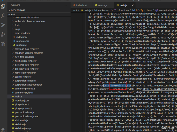 从代码来看,nodejs 进程只有一个文件 main.js ,是 webpack 的构建产物,看源码这里的 BrowserWindow 的 webPreference 参数是把 devTools 禁用掉的,导致直接在命令行里敲 openDevTools 是不能检视任意窗口的。