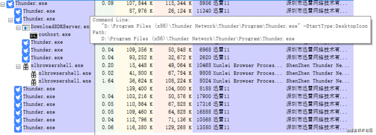 在进程树里可以看出来,几乎全部的进程都是 Thunder.exe,可见 Thunder.exe 作为进程派发入口(类似 server 的网关,而并不直接是业务本身),用户启动的时候传参是 --StartType:DesktopIcon,随后它唤起了两组进程,一组是 Electron main 进程,main 进程唤起相关的 renderer;然后是下载的 SDK 服务 DownlaodSDKServer。那么迅雷的进程关系差不多是清楚了:多个 Electron 窗口,对应一个 DownloadSDK。
