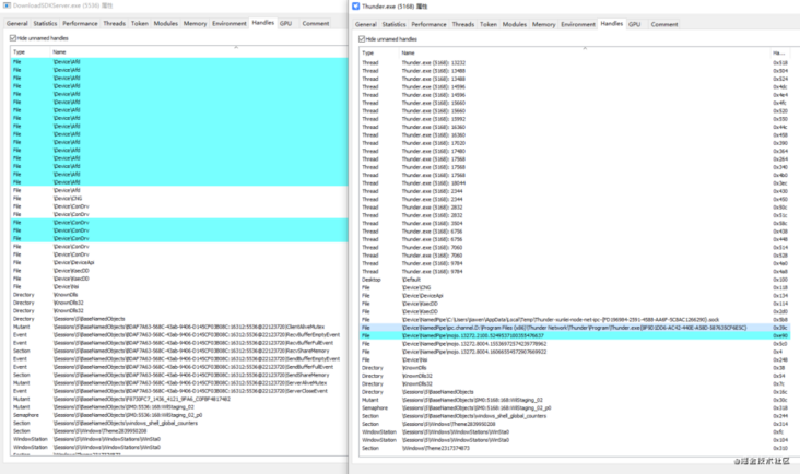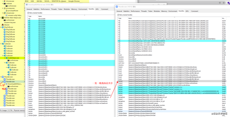 y.shellExecute(0, "open", o, B, H, "SW_SHOW");很显然,DownloadSDK 是通过一个 ThunderHelper.node 的 nodejs addon 模块来启动、通信的。我们知道, nodejs 可以通过 ffi 等方式实现内存共享,以达到两个进程不需要通过 pipe/sock 等管道就达到通信的目的。而通过工具观察 Thunder.exe 的唤起关系、句柄关系,两者的关系就更加一目了然了:ELectron 前端进程加载 DownloadSDK 进程,并且通过 \Sessions\5\BaseNamedObjects\xx@22123720|SendShareMemory 这种内存通道来实现的通信,句柄一一对应上了。