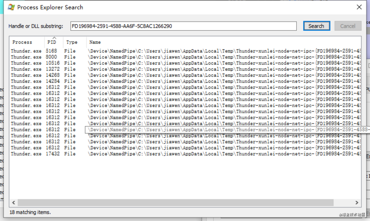 那么 Electron 的进程(甭管 main-process 还是 renderer-process,统称 electron进程) 和 DownloadSDK 是如何通信的呢?进程间通信一般都是依靠 ipc 管道的形式来实现。不过迅雷似乎没按套路来,它的 DownloadSDK 是控制台程序,意味着很有可能是通过 stdio 的方式来进行交互的(后续证明不是)。通过观察进程打开的句柄,看到很诡异的一个现象:DownloadSDK 并没有打开任何 ipc 管道,反倒是前端进程打开了一个。