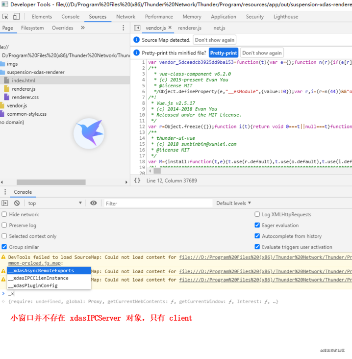 那么不妨做出一个大胆的推测:前端多窗口之间是靠自建的 ipc 通道实现的,而 ipc 是 1 server 对 N client 的方式,那么 server 很有可能就是在主窗口上的,也就是前文看到那个及其明显的 main-renderer 进程,通过控制台查看,确实如此,nodejs 的 net 方式创建了一个 server,并且将一个叫做 __xdasIPCServerInstance 的对象暴露在全局环境供前端 js 调用,也即 jsapi。