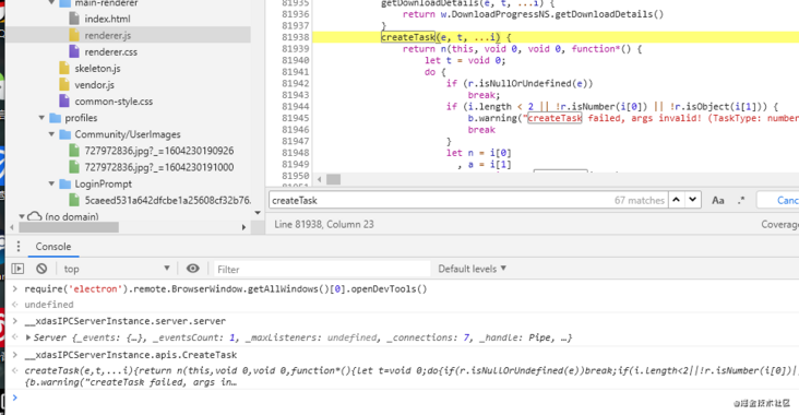 这样看起来就很奇葩了,前端进程之间是通过自建的 ipc 管道通信的,但是并没有跟 DownloadSDK 有任何通信管道,难道它俩是心有灵犀无言自通?啊这……程序员是唯物主义的!那怎么查它到底是怎么跟前端进程交互的呢?既然前端暴露了 server sdk instance,那意味着 DownLoadSDK 肯定是以一种 proxy 的方式暴露在这上面作为 jsapi 的。可以拿【创建一个下载任务api】来顺藤摸瓜。看了主窗口的 server instance 一下果然有这个方法:createTask ,应该就是前端用于创建下载任务用的 api。