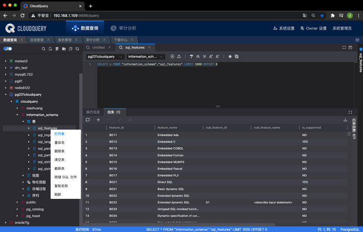 2、PostgreSQL 数据源菜单和结果集编辑功能 ① 数据源菜单功能包含:打开表、删除表、截断表、清空表、模式、视图、函数、转储 SQL 文件等。② 支持 PostgreSQL 数据源的结果集编辑与导出功能。