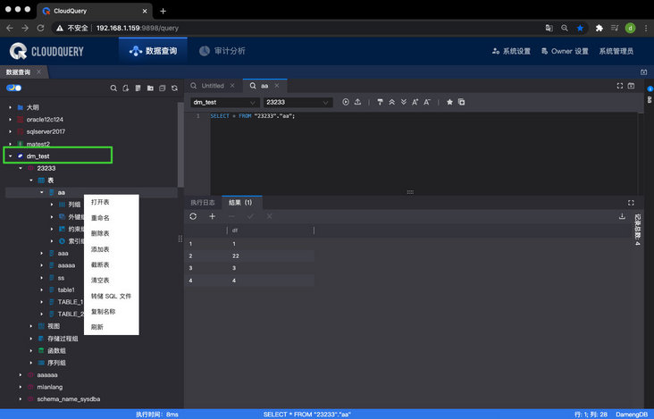 2、支持达梦数据源菜单和结果集编辑功能。① 数据源菜单功能包含:打开表、删除表、截断表、清空表、模式、视图、函数、转储 SQL 文件等。② 支持达梦数据源的结果集编辑与导出功能。
