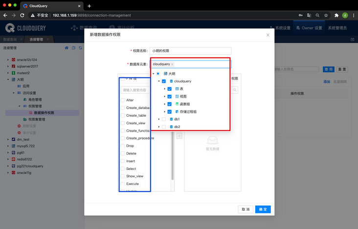 2、新增数据操作权限管理功能。可详细到具体数据库中某一表、视图,函数组、存储过程,并可对用户的指定操作进行授权,例如查看、DML、DDL 等,支持对指定数据库元素的权限约束。