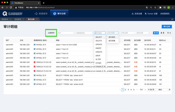 1、支持对语句类型、执行结果等条件的审计过滤。