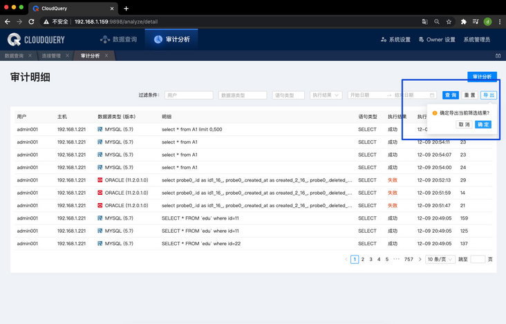 2、支持审计导出功能,可将审计明细数据导出为 Excel 表格。