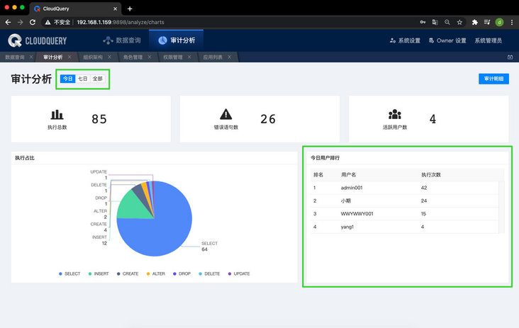 5、审计大屏功能。支持对今日、七日或全部数据进行审计分析,支持执行总数、错误语句数、活跃用户数、执行占比情况、以及用户的执行排行榜的展示。