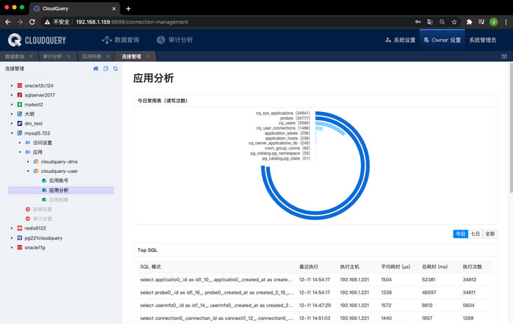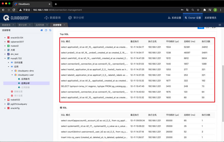 3、支持 Top SQL 排行功能。可在应用分析中查看今日、七日、全部的 SQL 的执行次数排行,并可以查看 SQL 的模式,最近执行的时间,执行主机,平均耗时,总耗时以及执行次数。