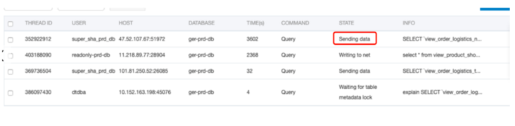 - 只读实例view_order_logistics_new相关的大查询执行了3602s还未执行完,一直持有表的DML读锁,不影响表的正常读写操作