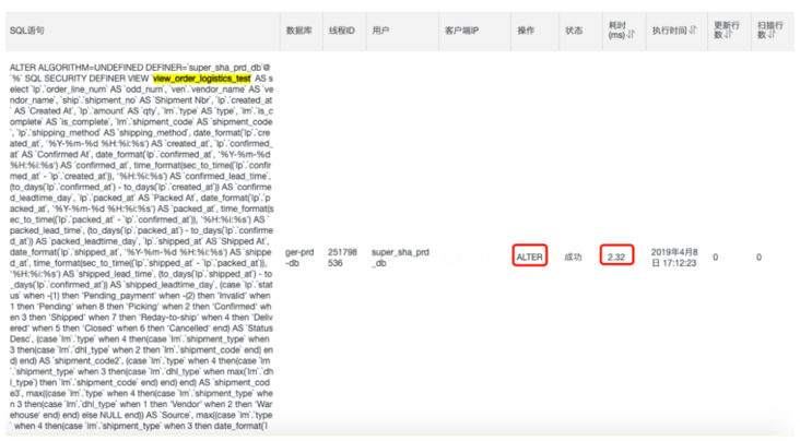 通过对审计日志的搜索,我们搜查到一条对视图定义进行alter的操作,该alter操作仅仅执行了2.32ms,其资源消耗本身并不大。