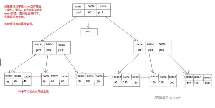如主键索引,如果一条SQL需要查询主键,那么正好根据主键索引就可以查到主键。再如普通索引,如果一条SQL需要查询name,name字段正好有索引, 那么直接根据这个索引就可以查到数据,也无需回表。