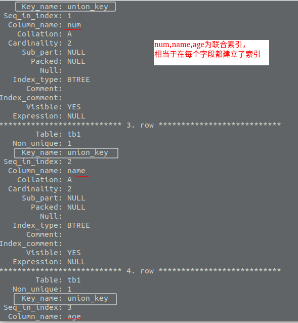 但可能由于版本原因(我的mysql版本为8.0.x),我创建的联合索引,相当于在联合索引的每个字段上都创建了相同的索引: