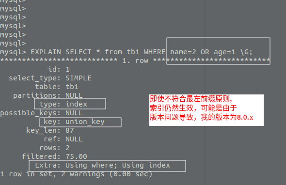 虽然我目前的Mysql版本较高,好像不遵守最左前缀原则,索引也会生效。 但是我们仍应遵守最左前缀原则,以免版本更迭带来的麻烦。