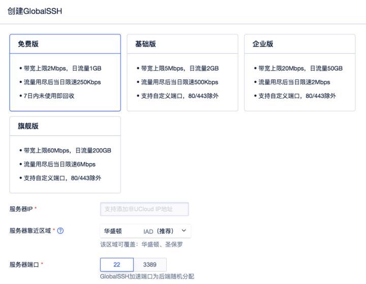 本次上线的GlobalSSH新版本包括免费版、基础版和企业版、旗舰版四个版本,不限制实例数量,支持加速任意源站IP。(注意:2020年9月14日前创建的实例类型为公测版,公测版功能维持不变可正常使用,不再支持新建)。