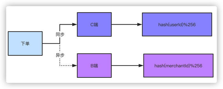 双写,双写就是下单的数据落两份,C端和B端的各自保存一份,C端用你可以用单号、用户ID做shardingkey都行,B端就用商家卖家的ID作为shardingkey就好了。有些同学会说了,你双写不影响性能吗?因为对于B端来说轻微的延迟是可以接受的,所以可以采取异步的方式去落B端订单。你想想你去淘宝买个东西下单了,卖家稍微延迟个一两秒收到这个订单的消息有什么关系吗?你点个外卖商户晚一两秒收到这个订单有什么太大影响吗?