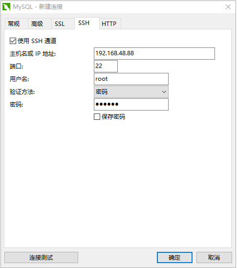 打开Navicat,点击文件->新建连接->点击SSH选项卡,勾选使用SSH通道,填写SSH连接的IP、用户名、密码,点击确定。注意这里全是SSH的地址用户名,不是数据库的。