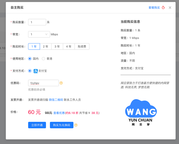 开通隧道,按需求进行购买,完成付费。