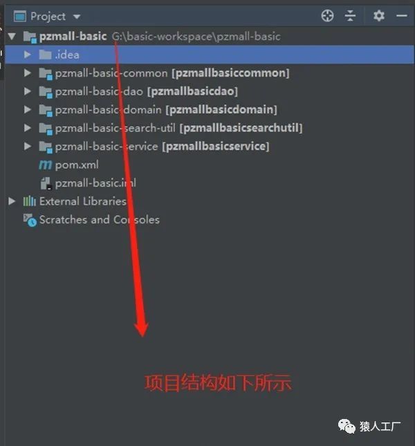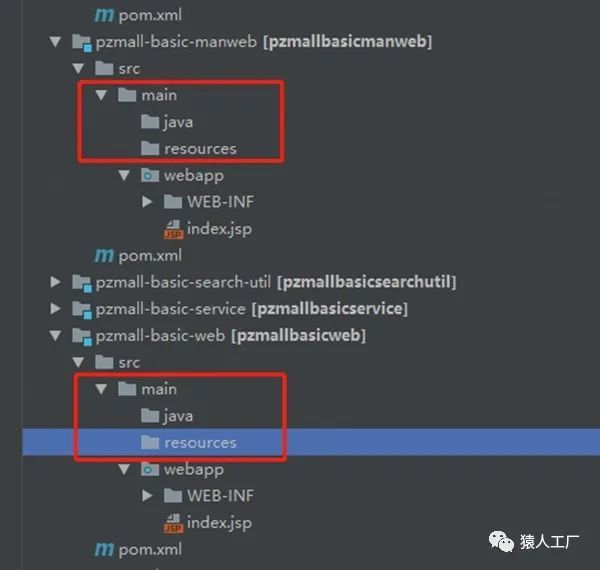 接下来,以葫芦画瓢,建立pzmall-basic-domain、pzmall-basic-dao、pzmall-basic-service、pzmall-basic-search-util几个子模块,最后得到如下结果。