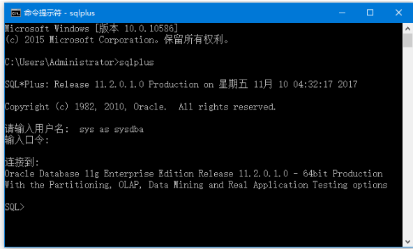 C:\Users\Administrator>sqlplus SQL*Plus:Release11.2.0.1.0Productionon星期五11月1004:32:172017 Copyright(c)1982,2010,Oracle.Allrightsreserved. 请输入用户名:sysassysdba 输入口令: