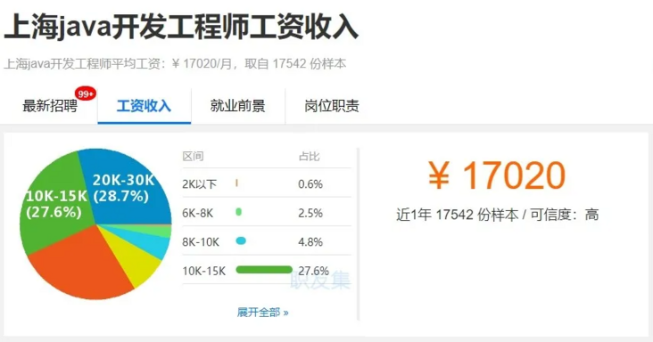 这个是上海java开发工程师的薪资待遇,这个薪资和广州,深圳,北京java开发工程师的薪资待遇相差不大。只要自己系统的去掌握好java,多做项目,积累经验,可以独立的完成项目框架开发,这样你的发展空间就更大。