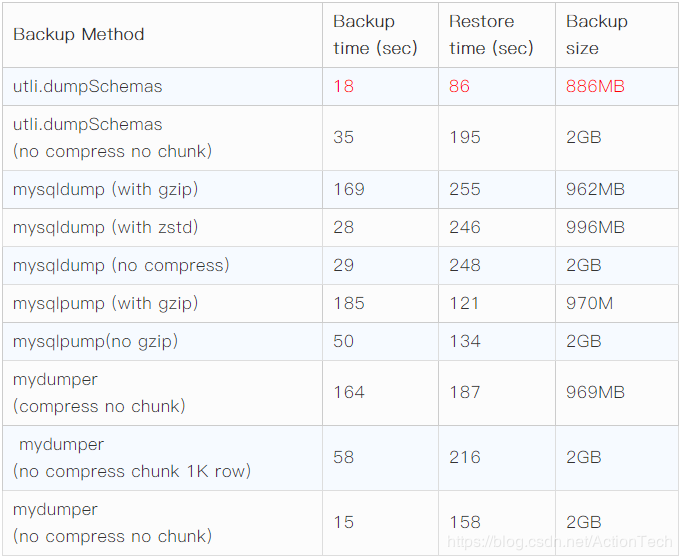 综合上述测试结果,mysql shell新的备份恢复方式是最快的,得益于使用了zstd实时压缩算法,备份恢复均可以并行,对于单个大表也可以并行。