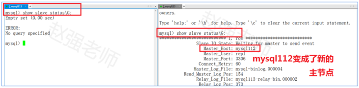 在mysql111上,执行shutdown操作 mysqladmin -uroot -pWelcome_1 shutdown MHA会自动进行主从切换。切换完成后,MHA进程会自动停止运行。 在mysql112和mysql113上观察,执行下面的语句: show slave status\G;