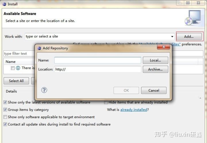 3、安装ADT,在打开后的Eclipse界面点击“Help”->"Install New Software...",点击弹出的“Install”窗体的“Add”按钮: