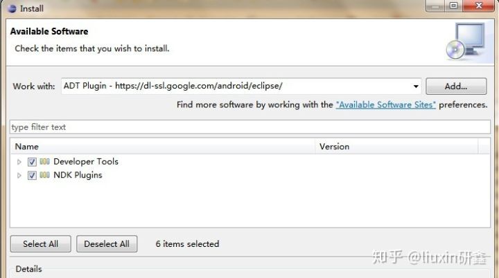 在弹出的“Add Repository”窗体中:“Name”自己随便取;“Location”输入http://dl-ssl.google.com/android/eclipse,点击“Ok”返回在“Install”窗体的“Work with:”选择刚才添加的地址后,下面会出现“Developer Tools”和“NDK Plugins”全部勾选,然后按提示一步步“next”完成安装。