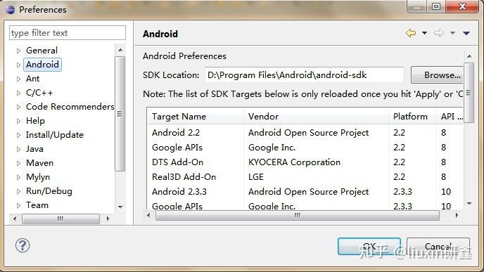 4、设置Android-SDK保存路径,在打开后的Eclipse界面点击“Window”->"Preferences"->"Android"点击“Browse”选择一个保存Android-SDK的路径后点击“Ok”确定: