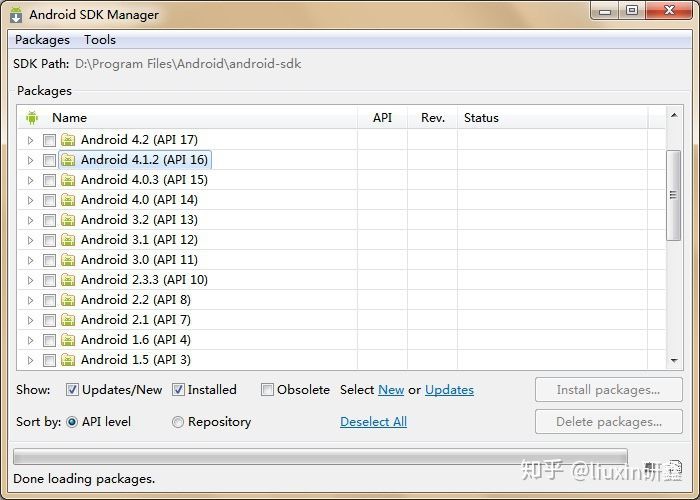 5、下载Android-SDK,在打开后的Eclipse界面点击“Window”->“Android SDK Manager”,在弹出的“Android SDK Manager”窗体会列出所有可供下载的SDK版本,根据需要勾选并下载相应版本的SDK: