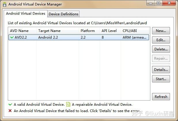 输入名称并选择SDK版本后点击“Ok”保存后回到“Android Virtual Device Manage”窗体界面,可以看到刚才添加的虚拟安卓设备名称,单击选择该设备并点击“start”->"Lunch"运行该虚拟设备: