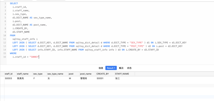 解释下这个 SQL,我要获取 S0003 的个人信息,sex_type、post、create_by 是 code 编码,需要转化为名称,方便前端展示。那我就需要去关联字典表和员工表,造成 SQL 需要进行三次关联。