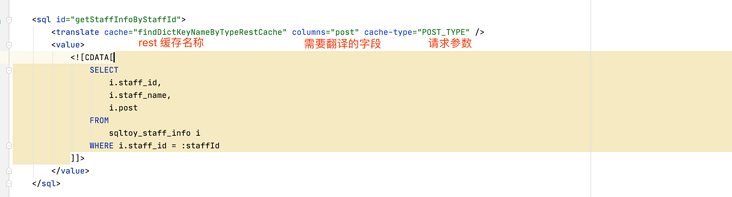 第二步,在需要翻译的业务 sql 语句上,配置缓存翻译功能,并指定使用的缓存名称、需要翻译的 key 值。例如: