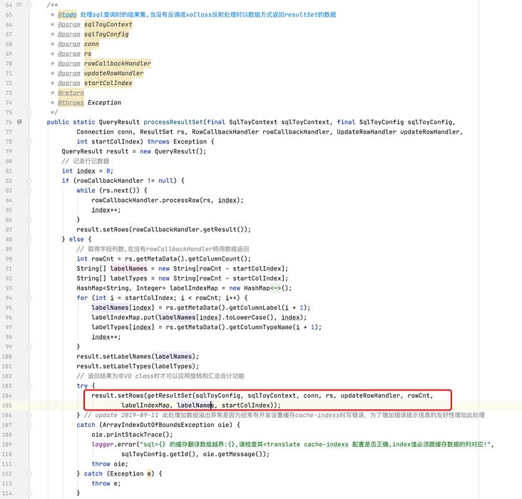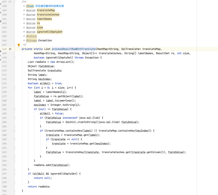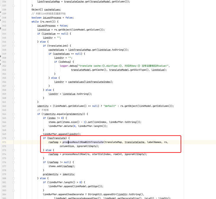 假设缓存数据不为空,缓存标记为 true,方法一直往下运行,找到 370 行(我标记的位置),先是判断缓存标记是否为 true,为真则进入 processResultRowWithTranslate 方法,我们进入该方法。