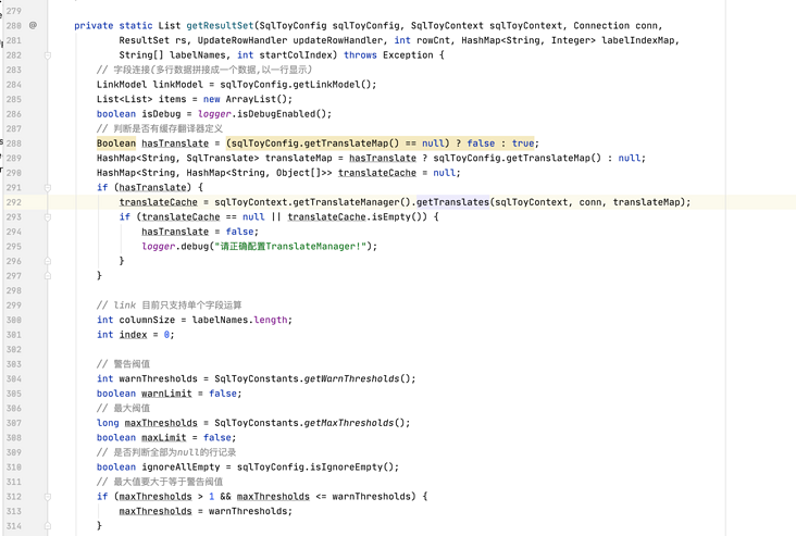 缓存数据取到了,我们回到 getResultSet(),看到 293 行,缓存数据为 null 或为空,则把 288 行的缓存翻译器标记赋值为:false。