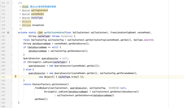 283 行获取缓存上数据源,如果没获取到就获取当前 sql 解析的数据源,然后 288 行判断缓存有没有传入参数,也就是
