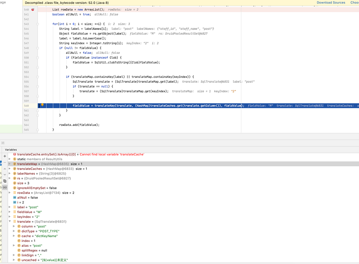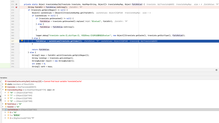 cacheValues 是根据翻译的 code 编码获取到对应的缓存对象,如果没有获取到,则代表没查到这个 code 编码的中文信息,打印错误日志。对象存在,就根据翻译器的下标获取中文名称,赋值给 fieldValue 并返回。