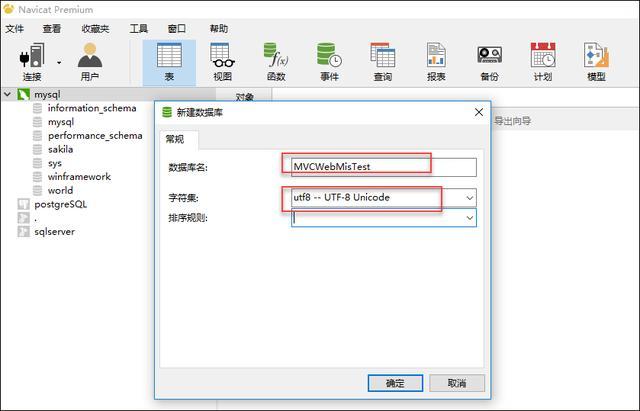 例如我们创建一个和SQL Server数据库同名的MVCWebMisTest数据库,并且设置它的字符集为默认或者UTF8的编码方式,如下所示。