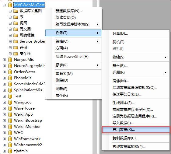 然后利用SQL Server Management Studio进行数据的直接导出,选择【任务】【导出数据】,如下所示。