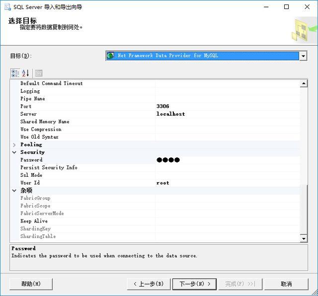 然后在目标里面选择Mysql的驱动,填入相应的信息,如下界面所示。