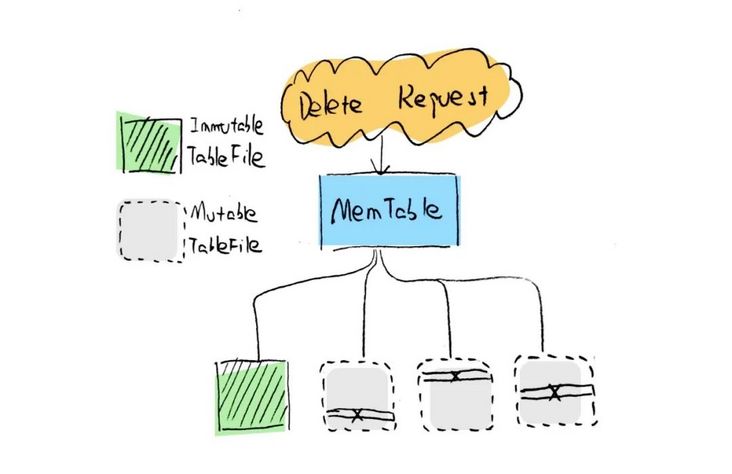 我们将删除 API 定义为删除一个 Collection 内所有与传入的 Entity ID 对应的数据。设计删除功能时,我们首先把删除分为两个场景:第一种是删除依然还在 insert buffer 中的数据,第二种是删除已经落盘的数据。第一种场景比较直观,我们可以通过 ID 找到对应 MemTableFile,然后在内存中直接将数据删除(图一)。因为删除不能与插入数据同时进行,并且因为存在上篇文章中提及的落盘时将 MemTableFile从Mutable 转为 Immutable 状态的机制,删除操作只会在 Mutable buffer 中进行,所以删除操作也不会与落盘操作发生冲突,从而保证了数据的一致性。