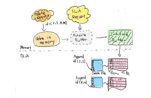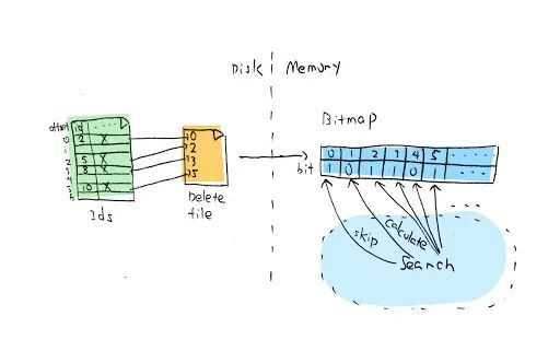 第二种场景相对更加复杂,也更加常见,因为大多数情况下数据停留在 insert buffer 中的时间都会很短,在短时间内就会落盘。将那些已经落盘的数据加载上来进行硬删除的方案效率太低,所以我们采用了另一种更高效的方案:软删除;不真正删除落盘的数据,而是另外存一份文件记录被删除的 ID。在进行需要读取数据的操作,例如搜索时,过滤掉那些已记录的被删除 ID。