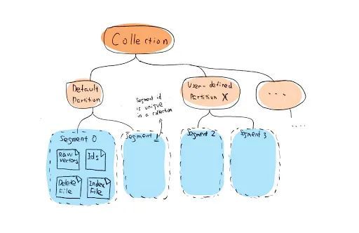 第二个问题是 Milvus 的原始文件和索引文件是两个独立的文件,在元数据中也是两行独立的记录。当删除某个 ID 时,我们需要找到 ID 对应的原始数据文件和索引文件,并且一起记录。于是,我们引入 segment 概念,一个 segment 包含原始文件(原始文件又包括原始向量文件和 ID 文件),索引文件,和记录被删除 ID 的 DEL 文件。segment 作为数据的基本读写和搜索单元,一个 Collection(图三)由多个 segment 组成,在磁盘上则是一个 Collection 文件夹下有多个 segment 文件夹。因为我们的元数据基于关系型数据库(SQLite 和 MySQL),记录 segment 内的关系非常简单,删除操作也不再需要对原始文件和索引文件做分别的处理。
