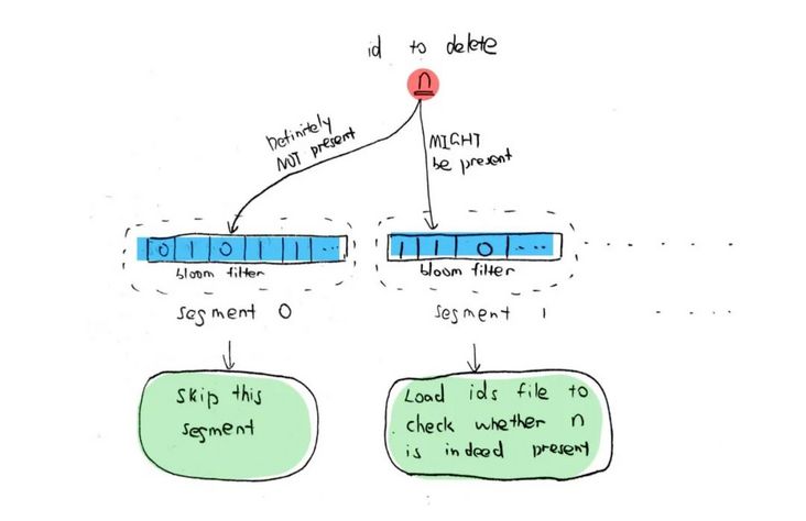 最后一个问题属于优化:对落盘的文件进行删除时,需要首先找到被删的 ID 具体存在于 Collection 中的哪一个 segment,再记录它的 offset。最暴力的方法当然是将每一个 segment 中的 ID 都暴搜一遍。我们想到的优化方法是在每个 segment 内添加一个 bloom filter(布隆过滤器)。Bloom filter 是一种随机数据结构,用于判断一个元素是否存在于一个集合中。因此,我们可以只加载每个 segment 的 bloom filter,只有 bloom filter 判断被删的 ID 在当前 segment 中,我们才在该 segment 内寻找其对应的 offset,否则我们就可以忽略此 segment(图五)。我们选择 bloom filter 的原因是因为相比其他数据结构,例如哈希表,它用的空间更小,并且查询效率非常高。虽然 bloom filter 有一定概率存在 false positive(错误判断元素存在),但因为这个概率可以自己调节,我们可以将需要搜索的 segment 降到理想数量。Bloom filter 也需要支持删除,否则已被删除的 Entity ID 依然会在 bloom filter 中找到,导致误判率增加。因此,实现的时候,我们使用的是支持删除的 counting bloom filter。在这篇文章,我们不会对 bloom filter 的详细原理做太多介绍,感兴趣的读者可以参阅https://en.wikipedia.org/wiki..._filter。
