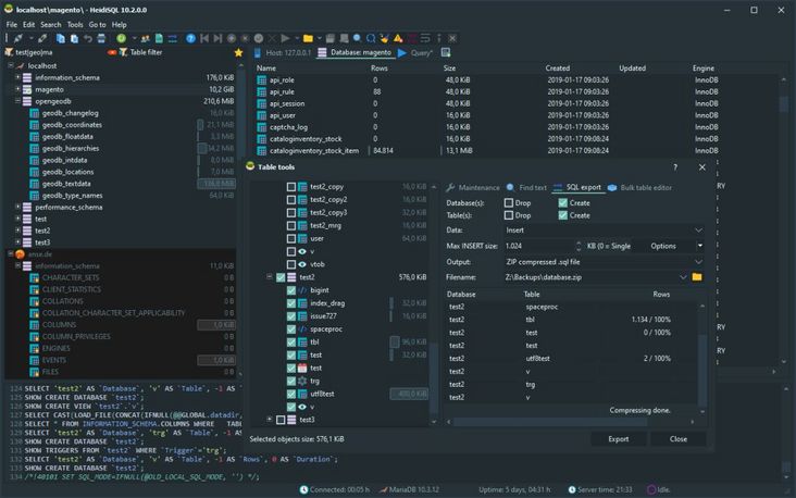 它可以浏览和编辑数据,创建和编辑表格,视图,过程,触发器和安排日程。另外,还可以导出结构和数据SQL文件。