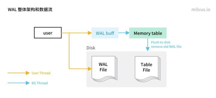 Milvus 的 WAL 设计也是如此。这里涉及了两个线程:一个是用户线程,另一个是后台线程。用户线程把修改操作写入 WAL 缓存和 WAL 文件后即可认为本次操作成功;然后由后台线程把 WAL 里的操作反映到系统状态里。当数据成功落盘后,系统会定期清理旧的 WAL 文件。整体架构和数据流参考下图。